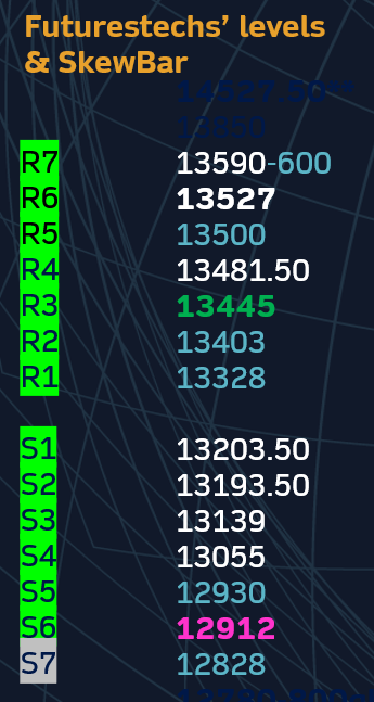 “There is a band of resistance coming into sight in the 13500s, as well as a Fibonacci level before that at 13445…Our Skewbar remains mostly green.“