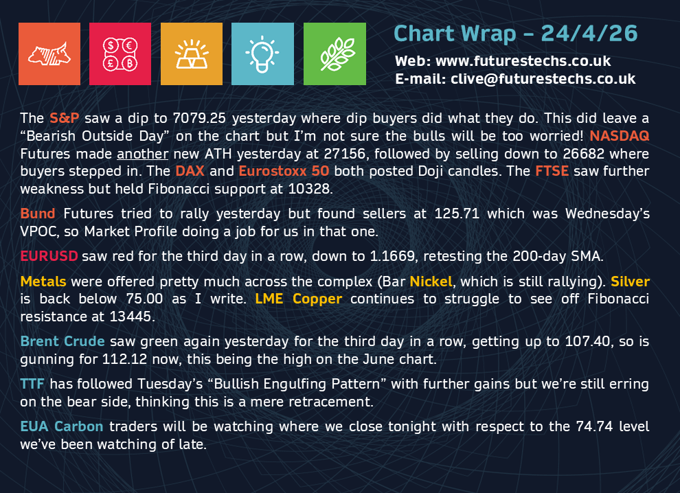 The S&P saw a dip to 7079.25 yesterday where dip buyers did what they do. This did leave a “Bearish Outside Day” on the chart but I’m not sure the bulls will be too worried! NASDAQ Futures made another new ATH yesterday at 27156, followed by selling down to 26682 where buyers stepped in. The DAX and Eurostoxx 50 both posted Doji More candles. The FTSE saw further weakness but held Fibonacci support at 10328.