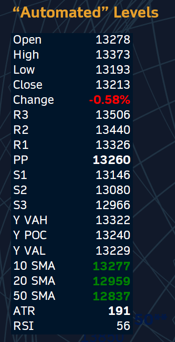 •Bigger Picture thoughts and targets: 13445-13527 is a big area of resistance. – Weighing currently.