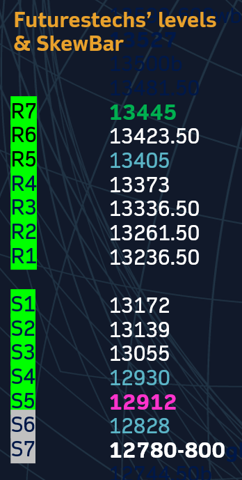 Not yet, then! Gains to 13373 yesterday early on found sellers and we then saw weakness back to 13193, then 13172.50 overnight. Our Skewbar remains a mostly green affair though.